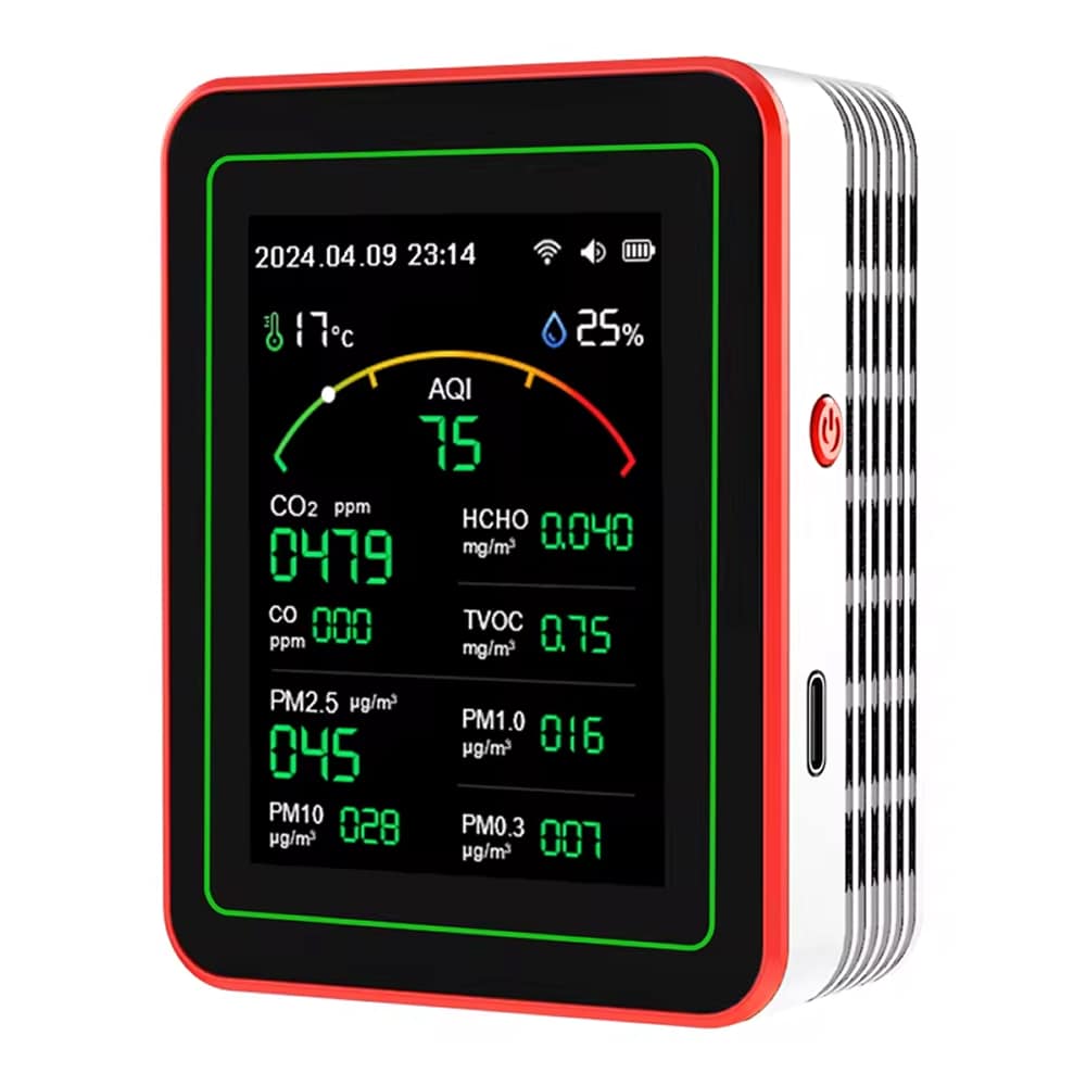 What sets the Airnovad CO2 Meter apart is its integration of 11 critical environmental parameters including CO2, CO, formaldehyde (HCHO), TVOC, PM0.3, PM1.0, PM2.5, PM10, temperature, humidity, and AQI calculations. The infrared CO2 sensor delivers reliable readings while semiconductor sensors handle other gases, creating a cost-effective multi-parameter solution that typically requires multiple separate devices.
