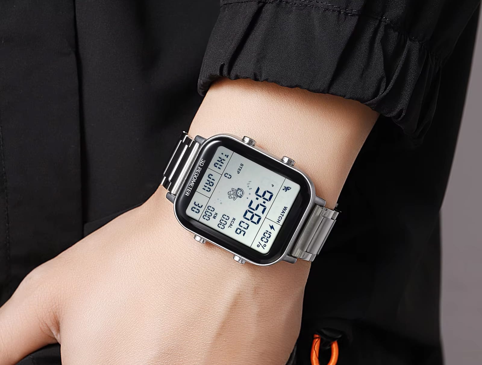 The 30-meter water resistance and stainless steel band ensure durability for all activities, from intense workouts to swimming sessions. The comprehensive tracking includes step counting, calorie calculation, distance measurement, dual time zones, and target management – all displayed on a clear glass mirror with EL backlight functionality.