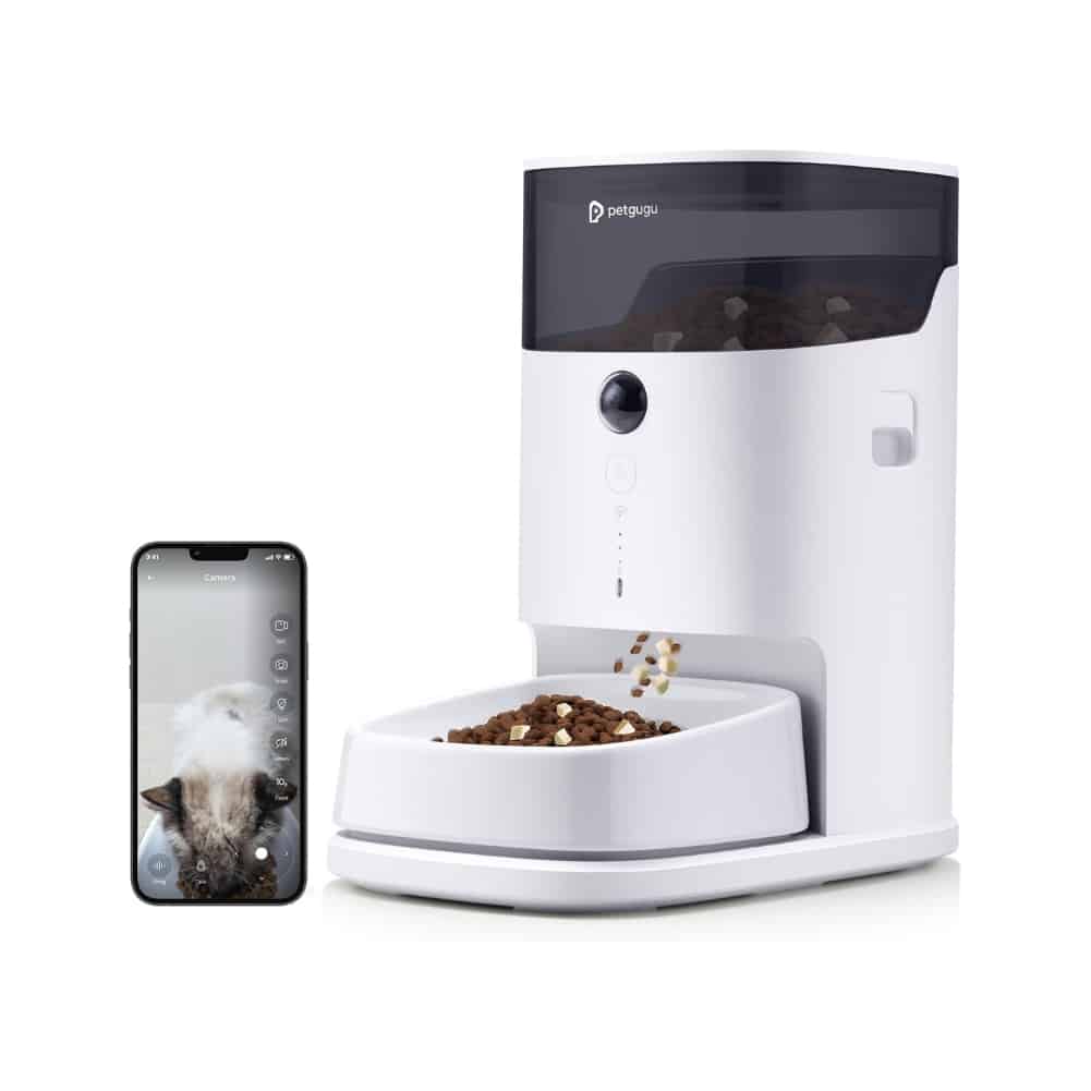 The PETGUGU Smart Pet Feeder distinguishes itself through integrated 1080p HD video monitoring with a 175° rotating camera, transforming feeding automation into a comprehensive pet surveillance system.